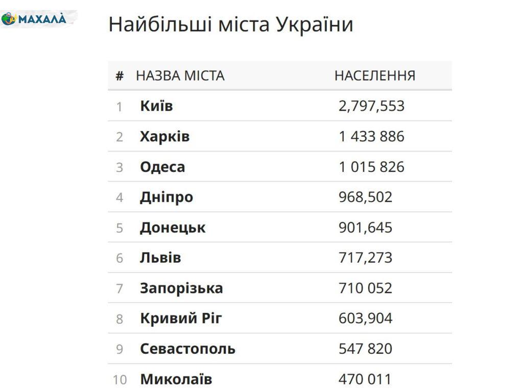 До найбільших міст України, які залишаються лідерами за чисельністю населення, належать мегаполіси-мільйонники — Київ, Харків, Одеса, а до п’ятірки найнаселеніших міст також входять Дніпро та Донецьк.