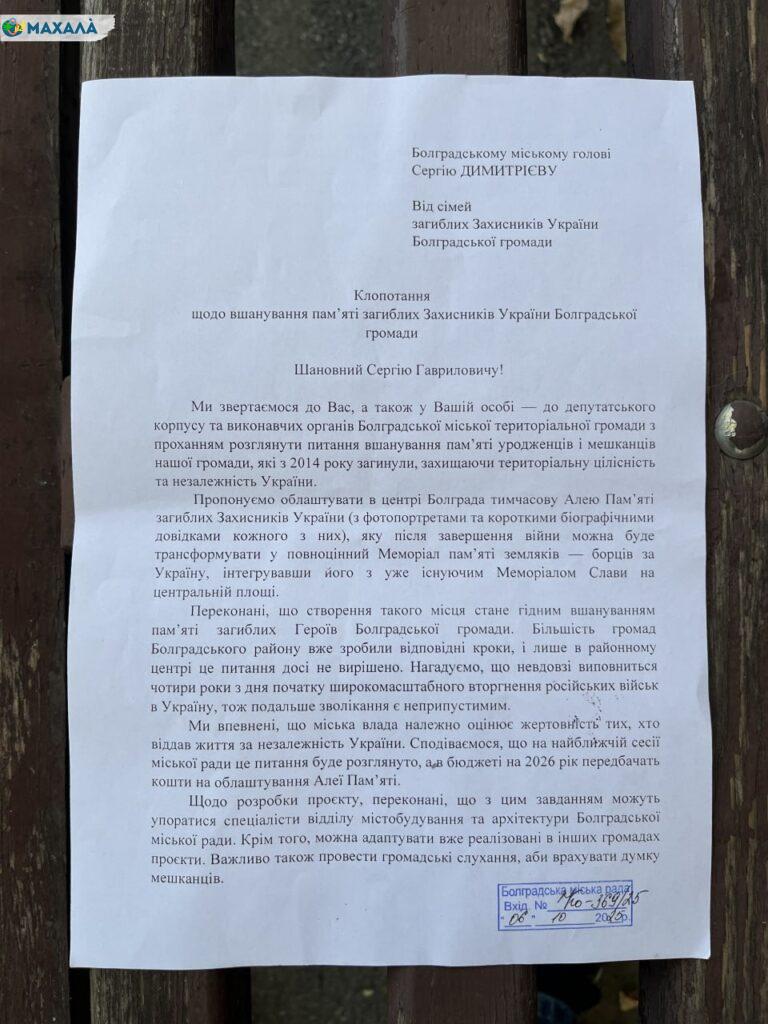 Родини загиблих захисників України з Болградської громади вдруге звернулися до депутатів міської ради з проханням розмістити тимчасову Алею Слави біля Меморіалу на центральній площі міста, а не у південно-західній частині скверу Захисників України, як було вирішено під час громадських слухань. Про це повідомляє “Махала”.