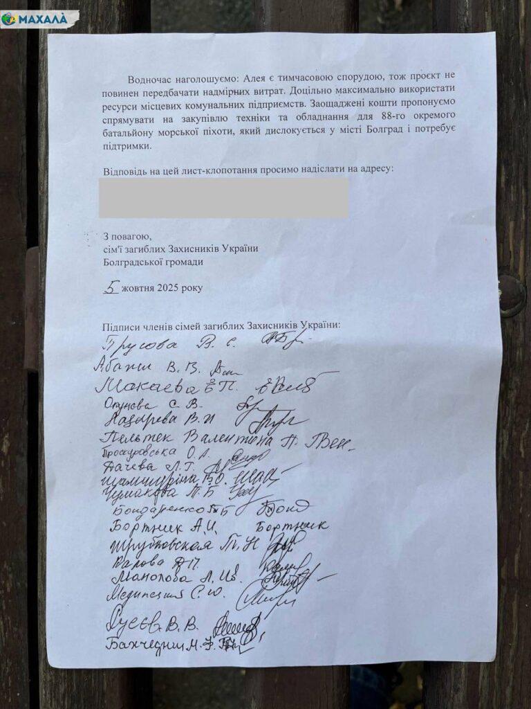 “ …закликаємо не вдаватися до гігантоманії та під час розробки проєкту Алеї, пам’ятати, що це ТИМЧАСОВА споруда. Отже, не планувати виділення на її створення гігантського бюджету, а по максимуму використати можливості місцевих комунальних підприємств для створення необхідних конструкцій. А зекономлені кошти пропонуємо направити на закупівлю необхідної техніки та обладнання для 88 окремого батальйону морської піхоти, постійне місто дислокації якого знаходиться у Болграді, та якій потребує допомоги».