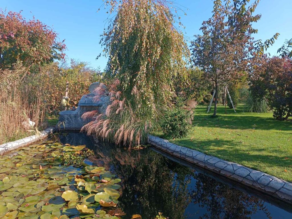 Сад навколо дому ніби живе своїм життям. У ньому все продумано й водночас природно: між зеленими галявинами розквітають квіти, поруч ростуть декоративні кущі й дерева, які навесні вкриваються біло-рожевим цвітом, а влітку дарують прохолоду. На поверхні ставків розкриваються ніжні німфеї, а поруч ростуть болотяні рослини, що додають саду дикої краси.