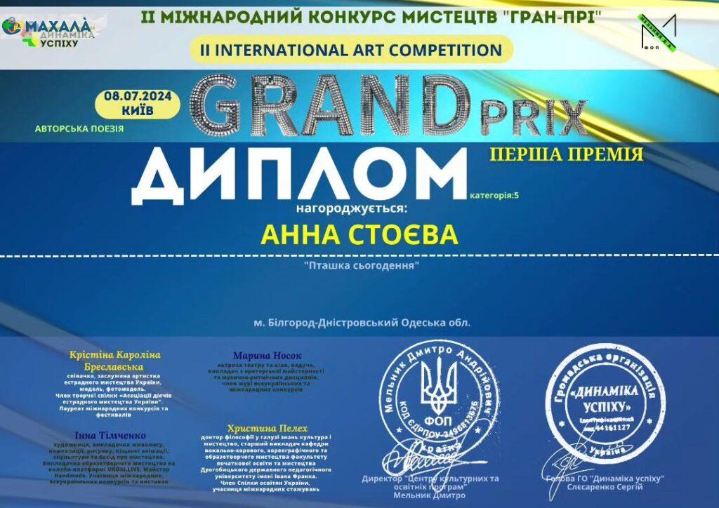 Анна Стоєва — буджацька поетеса, письменниця, ведуча та активна культурна діячка з Білгорода-Дністровського. Її творчість охоплює патріотичну лірику, дитячі вірші та пісні. Анна є ведучою культурних заходів, які проходять в її місті, і виконавицею авторських пісень. Її роботи сповнені любові до України та рідного Буджаку. Подробиці творчого шляху Анни Стоєвої дізнавалася журналістка «Махали».