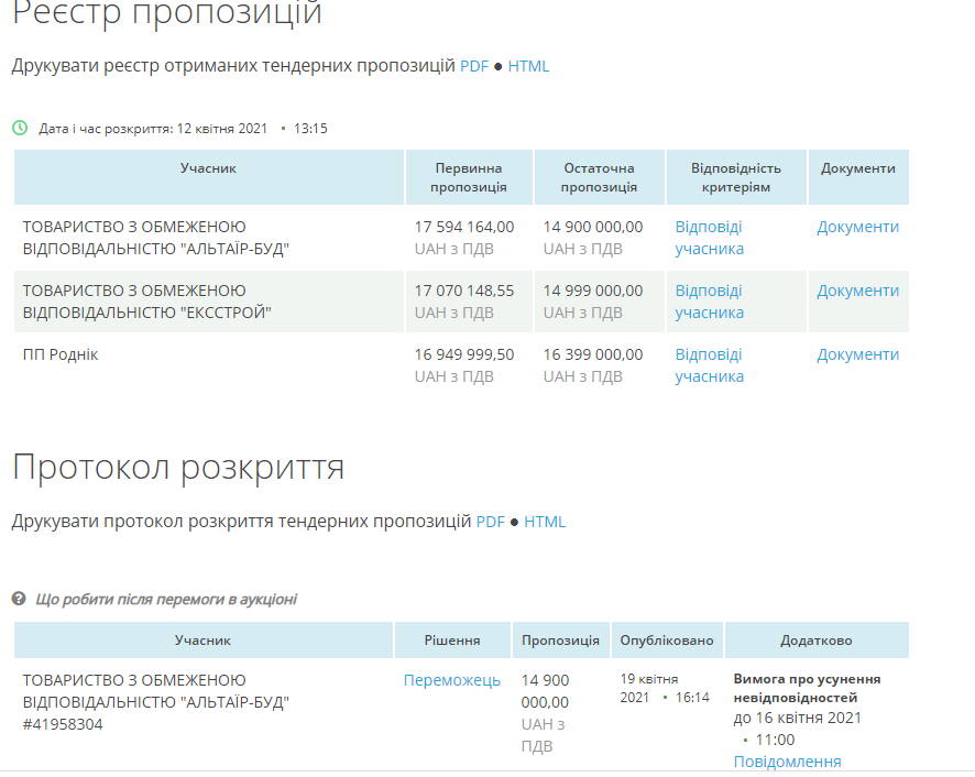 В торгах участвовали три претендента, победу одержало ООО «Альтаир-Буд», предложившее наименьшую цену — 14 млн 900 тыс. грн.