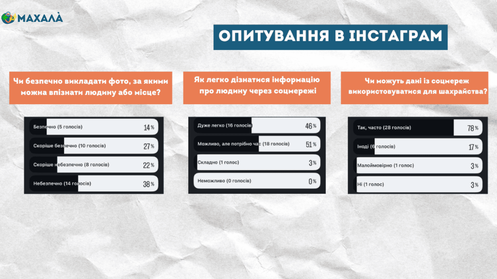 Щоб зрозуміти, наскільки читачі усвідомлюють ризики відкритості у соцмережах, редакція «Махали» провела опитування у власних Instagram-сторіс та Telegram-каналі й об’єднала відповіді, аби отримати загальну картину. Воно не претендує на повне відображення ситуації, однак дозволяє побачити окремі тенденції серед активної інтернет-аудиторії. Учасникам поставили три запитання про безпеку публікацій, можливість зібрати інформацію про людину та використання даних у шахрайстві.