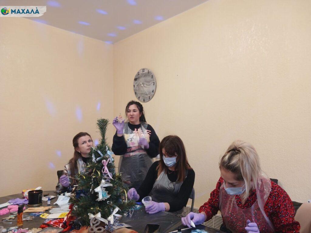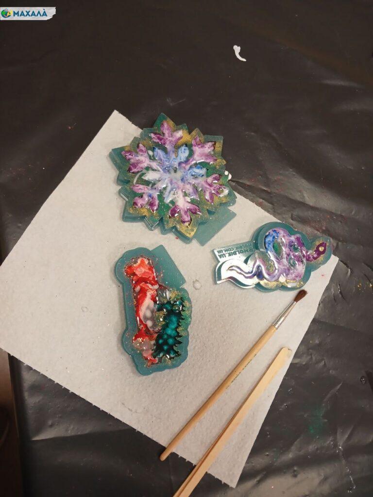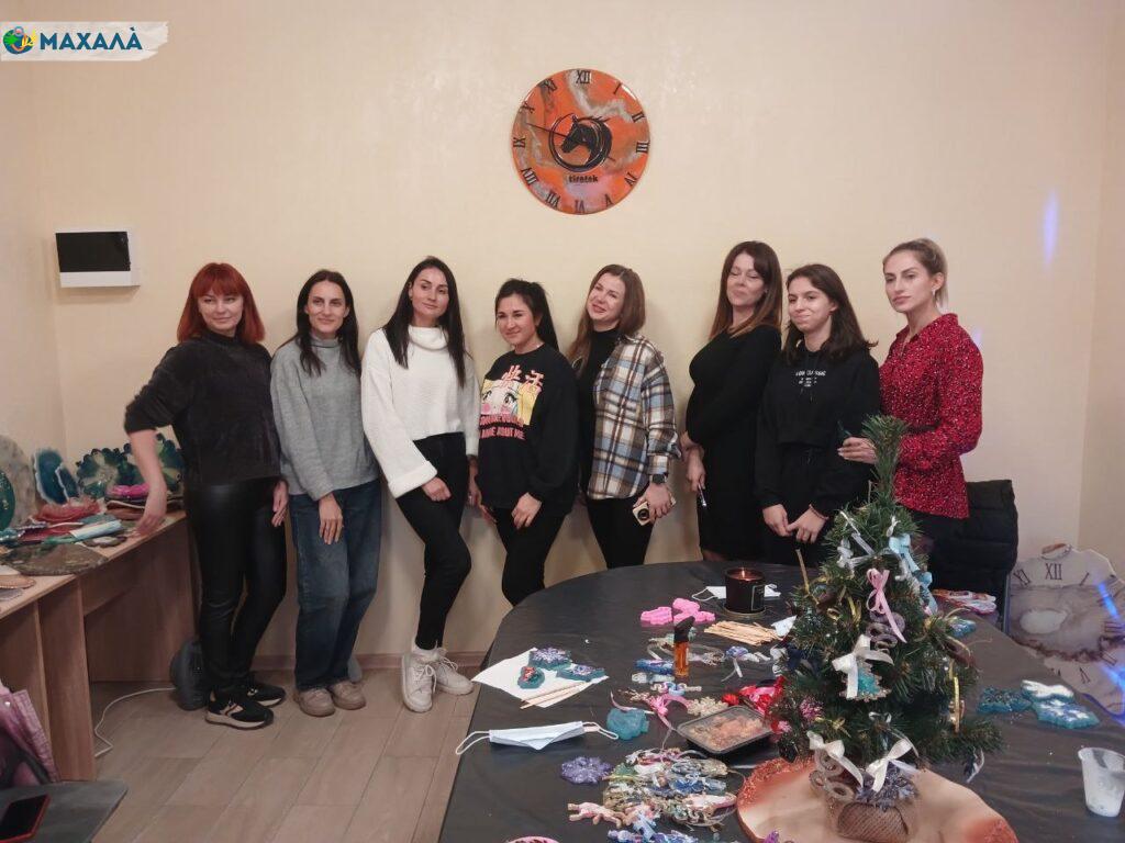 На заході панувала творча атмосфера: кожна учасниця мала можливість вибрати форму майбутньої прикраси – янголятко, змію, ялинку чи сніжинку. Анна детально пояснювала, як працювати з епоксидною смолою, яка славиться своєю стійкістю до подряпин, вологи й пошкоджень.