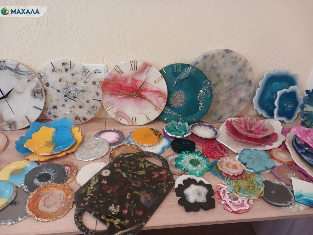 Окрім майстер-класу Анна зробила для гостей виставку своїх робіт. На виставці гості мали змогу насолодитися справжнім святом творчості: великі годинники, елегантні підставки для бокалів і телефонів, сувенірний посуд та інші унікальні вироби з епоксидної смоли вражали своєю витонченістю та оригінальністю. Кожен експонат випромінював тепло та любов майстрині, а яскраві дизайни викликали щире захоплення. Анна з гордістю поділилася, що кожна її робота – це частинка душі, створена, щоб приносити радість і натхнення, і ця виставка стала чудовим підтвердженням її таланту.