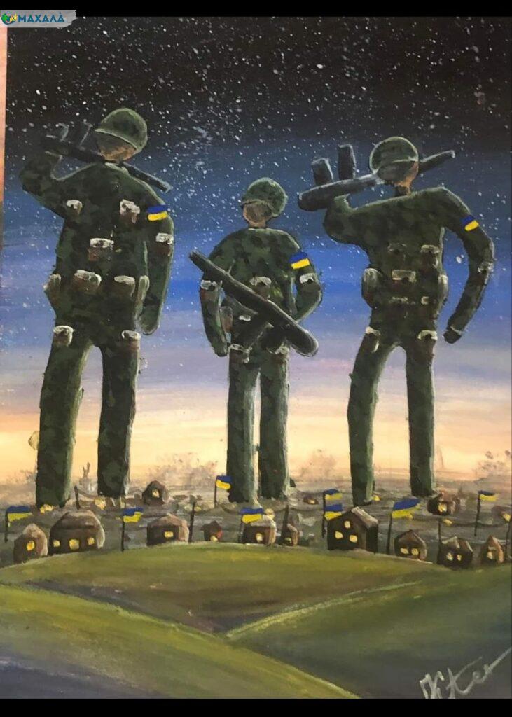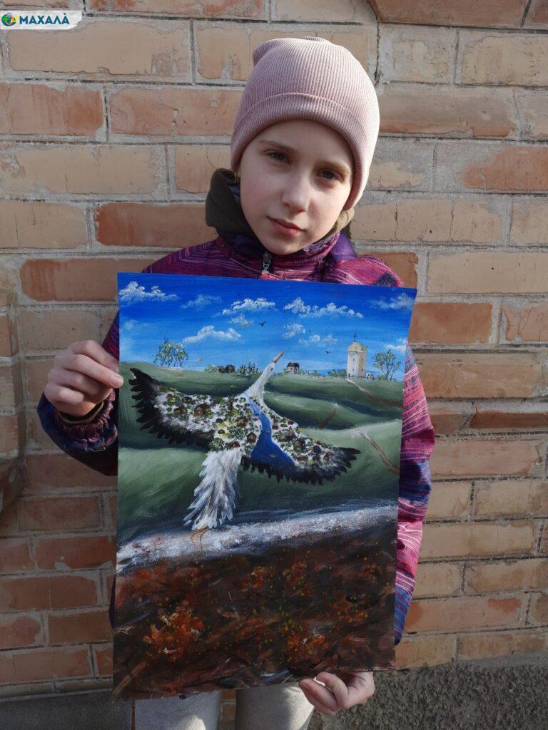 Ще одна символічна картина Кіри — лелека, що винирнув із попелу, несучи на крилах усе село. На цьому малюнку можна роздивитися будинки, дерева, річку — усе, що було дорого людям, але тепер втрачено через війну. Пані Олена вважає, що ці роботи дівчинка пише під впливом подій, які її глибоко вразили.