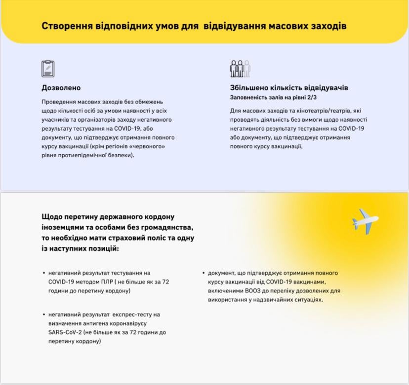 проведення масових заходів без обмежень щодо кількості осіб за умови наявності у всіх учасників та організаторів заходу негативного результату тестування на COVID-19 або документу, що підтверджує отримання повного курсу вакцинації;