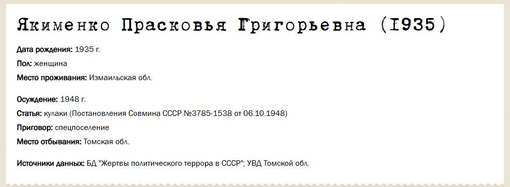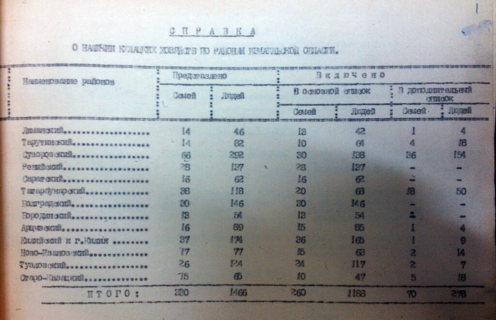 Пошук відповідних архівних матеріалів дав змогу виявити й інші документи. У збірнику, присвяченому сталінському ГУЛАГу, опубліковано наказ МВС про депортацію селян Ізмаїльської області, де зазначені конкретні прізвища посадових осіб, відповідальних за організацію виселення. Наразі не вдалося знайти затверджений перелік родин, яких депортували. Водночас із досліджень, присвячених радянським депортаціям, відомо, що загалом було виселено 1094 особи, серед них — 342 чоловіки, 405 жінок і 347 дітей віком до 16 років. Їх відправили до Томської області для роботи в Тегульдетському ліспромгоспі.