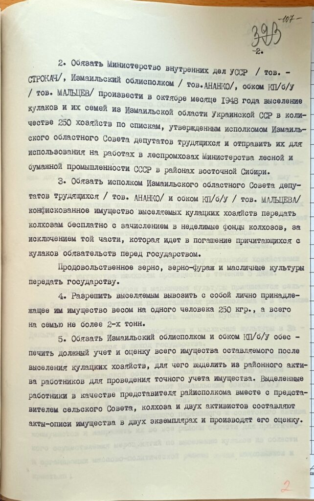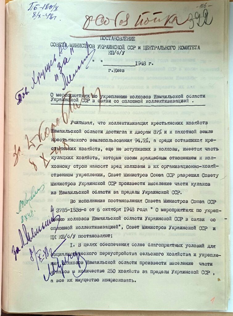 Як зазначає дослідник, сталінський режим прагнув розправитися з тими господарями, які намагалися зберегти власну землю, і ухвалив рішення виселити частину «куркулів» за межі УРСР. Постанова стосувалася виключно Ізмаїльської області, що свідчить про цілеспрямований репресивний характер акції в регіоні. Документ був ухвалений на виконання постанови Ради Міністрів СРСР від 6 жовтня 1948 року.