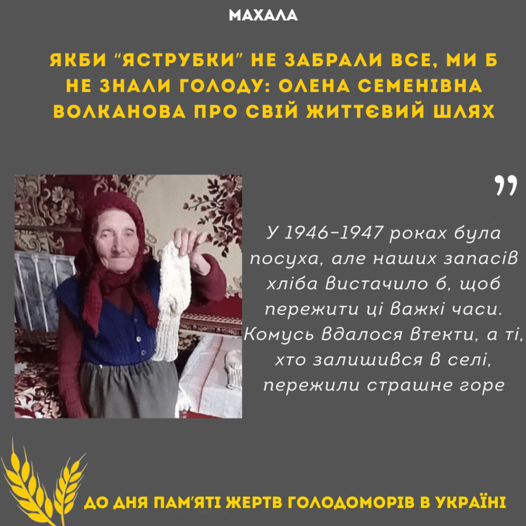 «Наші комори ломилися від зерна. Якби “яструбки” не прийшли й не забрали все до останнього, ми б не знали, що таке голод. Так, у 1946–1947 роках була посуха, але наших запасів хліба вистачило б, щоб пережити ці важкі часи. Комусь вдалося втекти, а ті, хто залишився в селі, пережили страшне горе», – розповідає пані Олена.