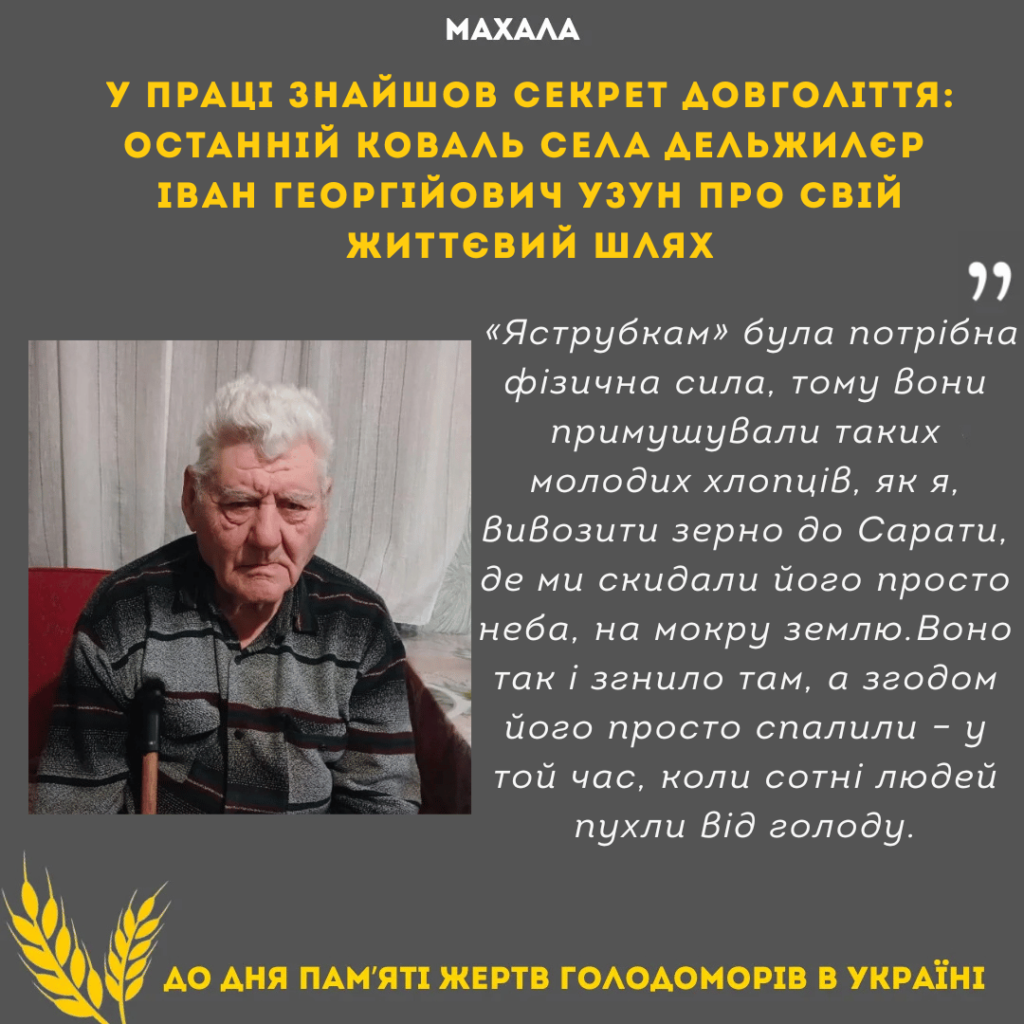 «Окрім землі та майна, «яструбки» стали вилучати у селян зерно, що призвело до штучного голоду. Багатьох чоловіків з нашого села відправили на Урал у 1945 році. На нашій вулиці жив дуже заможний чоловік, якого всі знали як Бондарувколювого Пилипа. «Яструбкам» була потрібна фізична сила, тому вони примушували таких молодих хлопців, як я, вивозити його зерно до Сарати, де ми скидали його просто неба, на мокру землю. Дощ, а потім сніг, падали прямо на ці купи зерна. Воно так і залишилося там гнити, а згодом його просто спалили – у той час, коли сотні людей пухли від голоду», – згадує Іван Георгійович ті трагічні події.