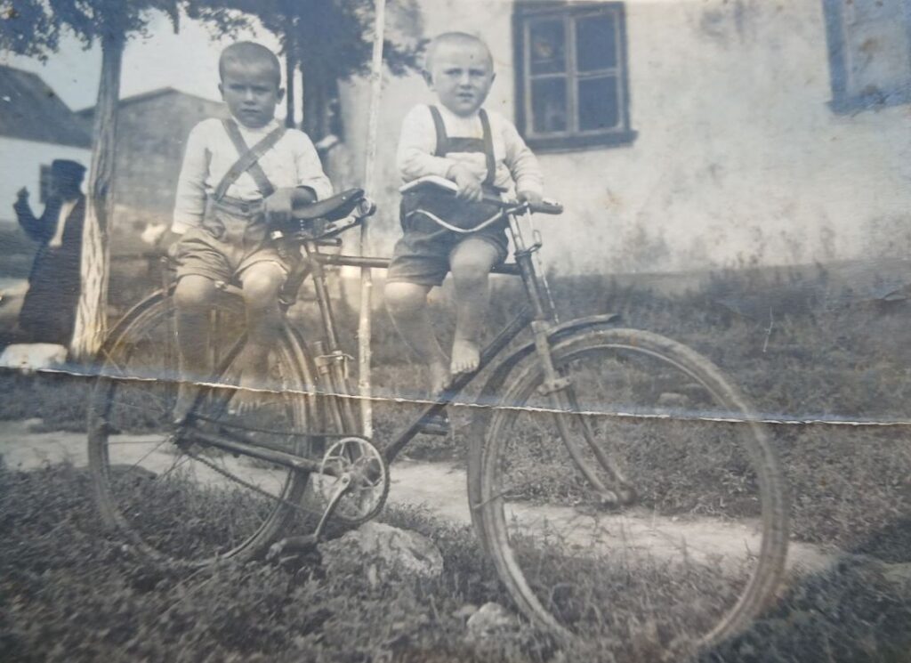 Маленький Валерій Іванович Максименко з другом на фоні трактиру бабусі і дідуся