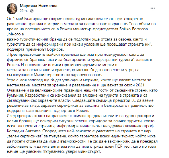 “Туристический сезон в Болгарии начинается 1 мая. Решение было согласовано с органами здравоохранения и Министерством иностранных дел “, – написала она.