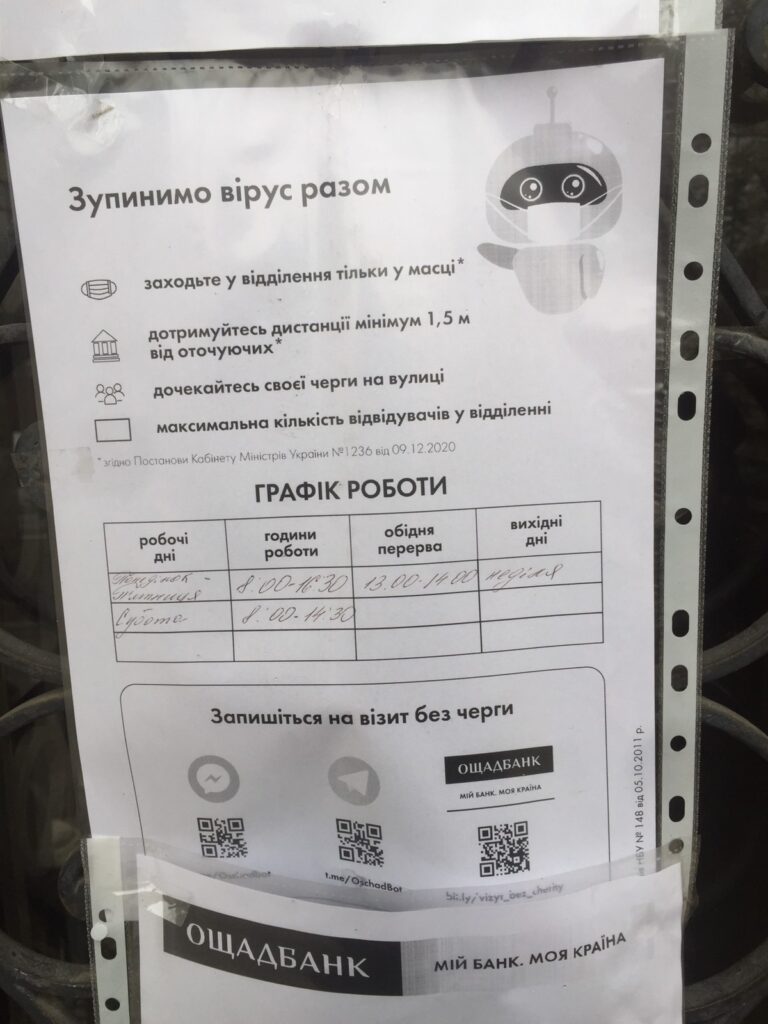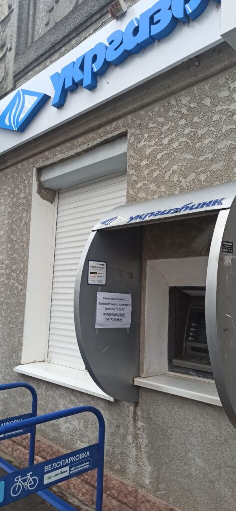 – отделения всех банков работают. Обналичить деньги можно в кассах. Банкоматы временно не работают, за исключением банкомата в ОЩАДБАНКЕ. Каждый банк обслуживает только своих клиентов. При себе нужно иметь документ, удостоверяющий личность. Обмен валют пока не производится до особых указаний.