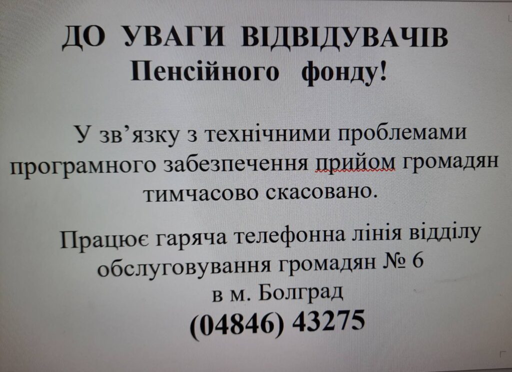 – Пенсионный фонд временно не работает. Работает горячая линия отдела обслуживания граждан №6 в г. Болград (04846) 43275.