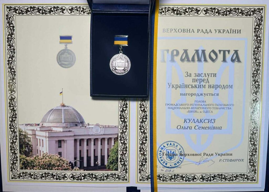 Ольга Кулаксиз відзначена Грамотою Верховної Ради України «За заслуги перед Українським народом» як голова громадського регіонального гагаузького національно-культурного товариства «Бірлік». Про це повідомляє «Махала».