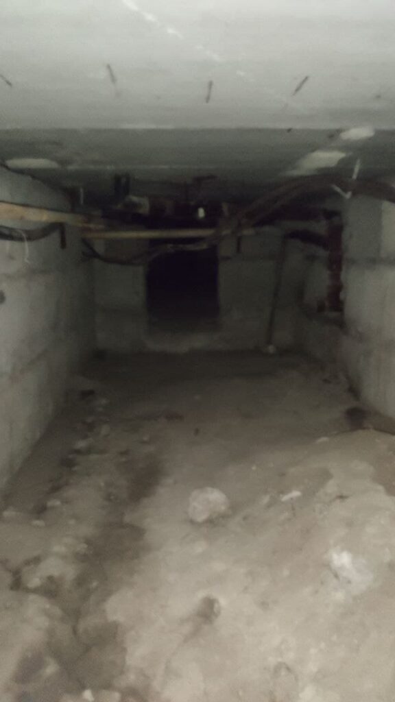 Укрытие располагается под зданием детского сада №5. Однако назвать укрытием его сложно. Электричества нет, лавок нет, много мусора, сыро и темно. Это просто подвал под детским садом.