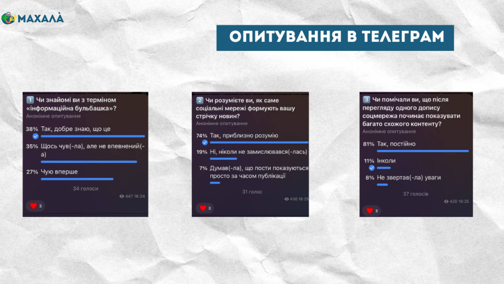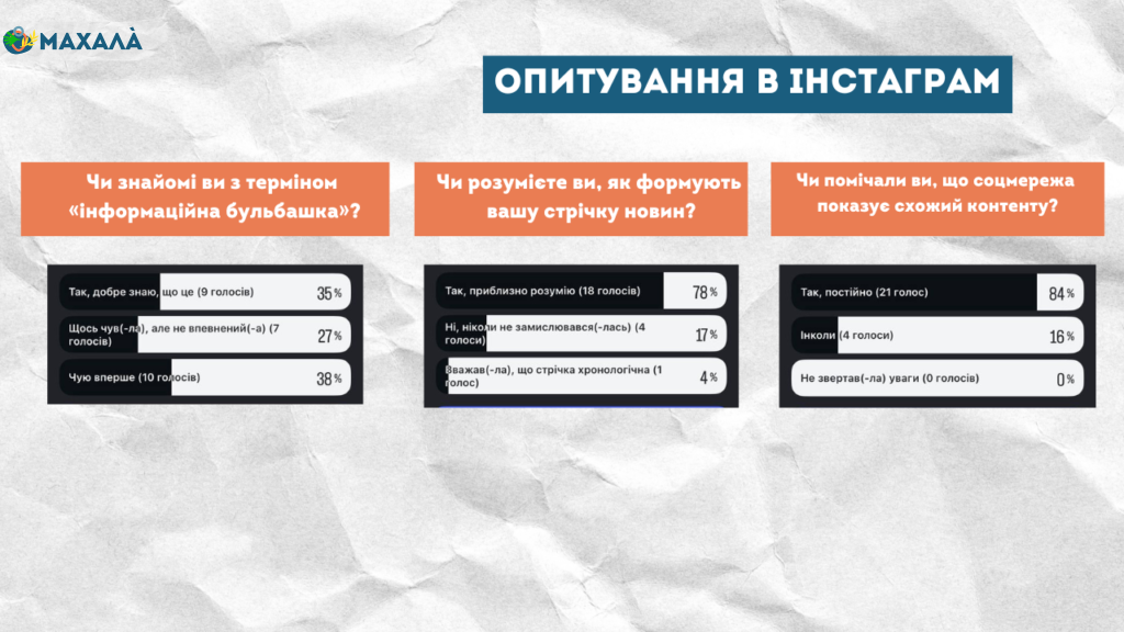 Щоб з’ясувати, як користувачі півдня Одещини розуміють роботу інтернет-алгоритмів, ми провели опитування на офіційних наших сторінках в Instagram та Telegram щодо теми інформаційної бульбашки в мережі. Користувачам поставили три запитання: про знання щодо самого терміна «інформаційна бульбашка», розуміння формування стрічки новин та власний досвід користування соціальними мережами.