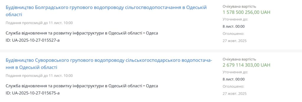 Будівництво Суворовського групового водопроводу сільськогосподарського водопостачання в Одеській області – 2 679 114 303,00 UAH з ПДВ