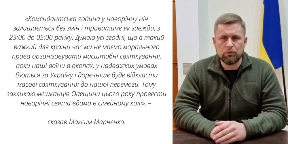 У своєму вечірньому зверненні голова Одеської обласної військової адміністрації Максим Марченко звернувся до мешканців Одеської області та розповів як пройде новорічна ніч.
