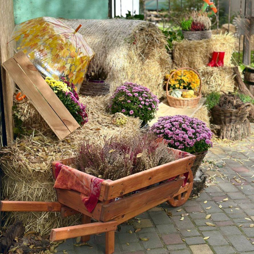 Підприємці прикрасили свій магазин та територію навколо дуже по-осінньому – із залученням різних квітів, гарбузів, ящичків, соломи і т.д.