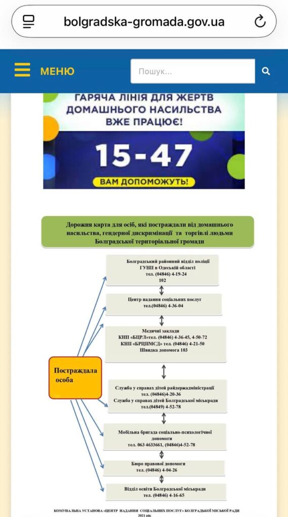 На офіційних вебсайтах рад району та на офіційних сторінках структурних підрозділів соціального захисту населення у мережі Facebook у розділі «Запобігання та протидія домашньому насильству» сформована та розміщена інформація щодо можливостей отримання допомоги. Там оприлюднені контакти організацій та установ, які надають послуги із захисту та підтримки осіб, що постраждали від домашнього насильства, а також відповідна «дорожня карта» дій, зокрема на прикладі Болградської міської ради.