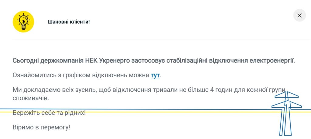 Якщо ж відключення відбуваються за відсутності будинку у графіку – просимо повідомити нас про це натиснувши на кнопку під графіком на сайті ДТЕК. В такому випадку спеціалісти додатково перевірять інформацію про ваш будинок та додасть адресу у графік у разі потреби.
