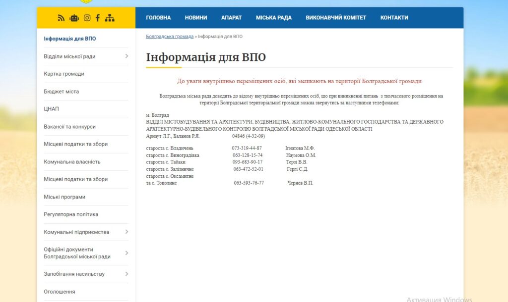На сайті Болградської міської ради є повідомлення, що сайт переїхав. Переходимо за посиланням на новий сайт. Вже тут є вкладника «Інформація для ВПО», де вказані номери телефонів відділу міської ради та старост сіл, які входять у склад громади. Поточної інформації щодо кількості наявних місць там нема.