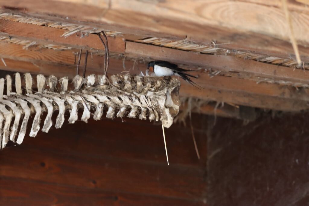 Серед цього природного дива з’явився зворушливий і глибоко символічний момент. Одна з пар ластівок вирішила вивести ще одне, друге потомство — і збудувала нове гніздечко… на хребті загиблого дельфіна-афаліни. Цей хребет, як і багато інших решток морських ссавців, зібрано вздовж узбережжя Чорного моря як нагадування про жахи війни, яку росія розв’язала проти України.