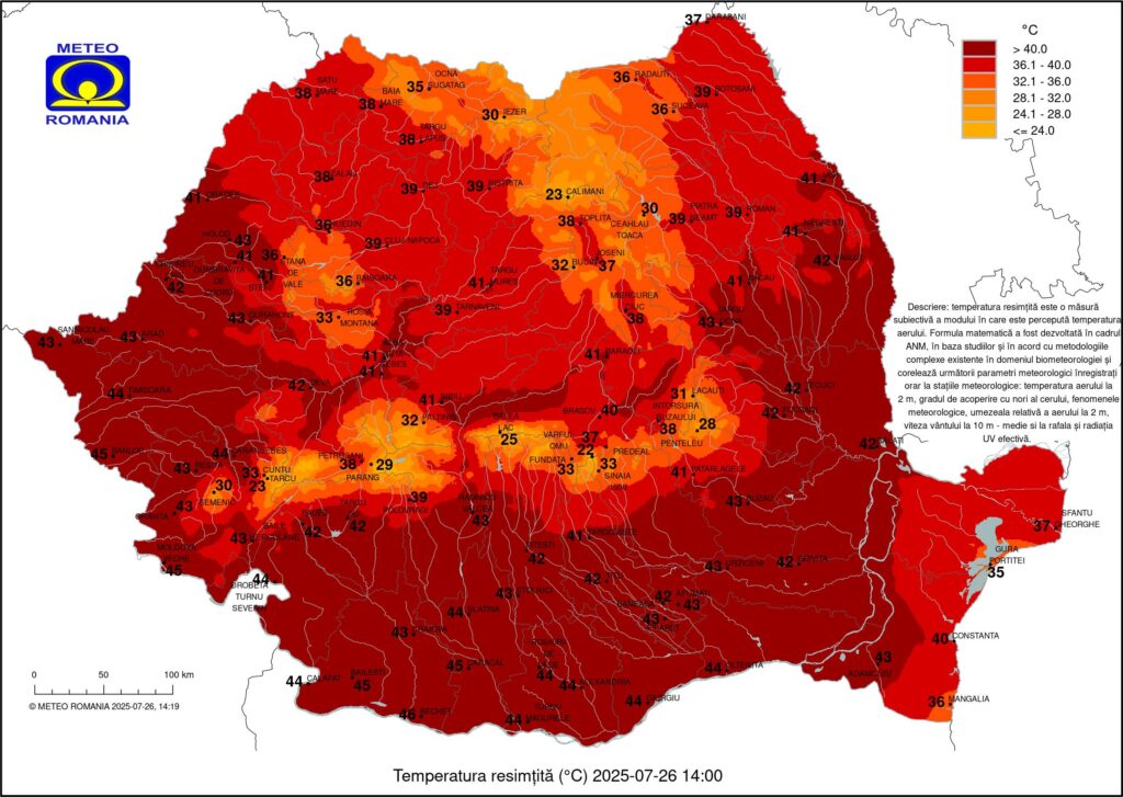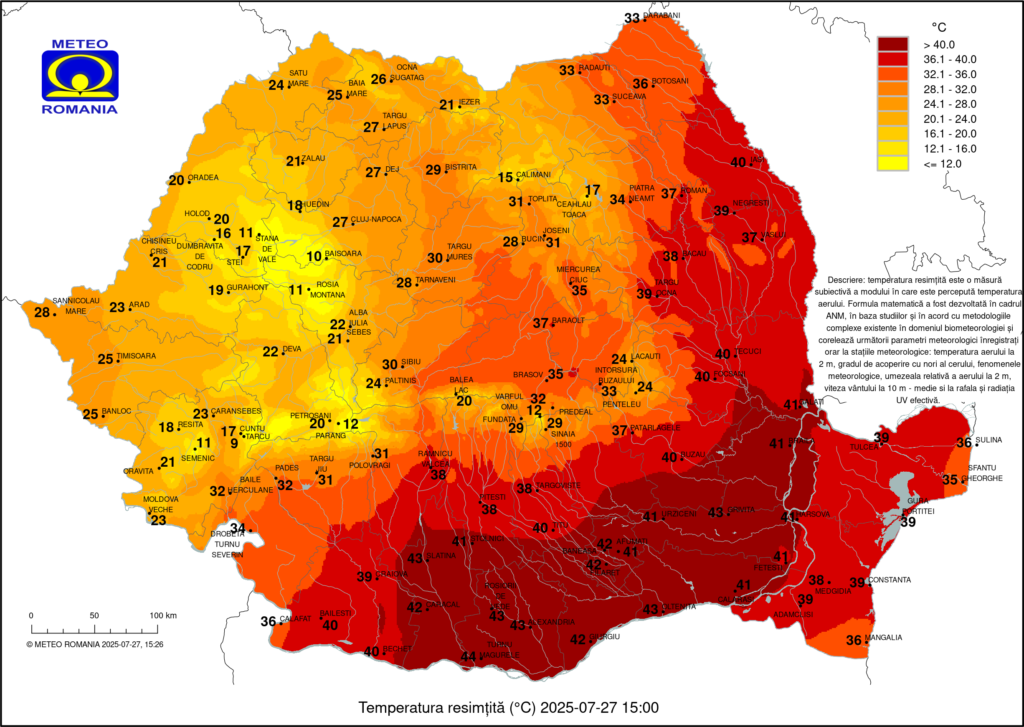 Станом на 15:00 27 липня, згідно з даними сайту Meteo Romania, найвища температура зафіксована у місті Мегуреле (повіт Ілфов) – 44°C.