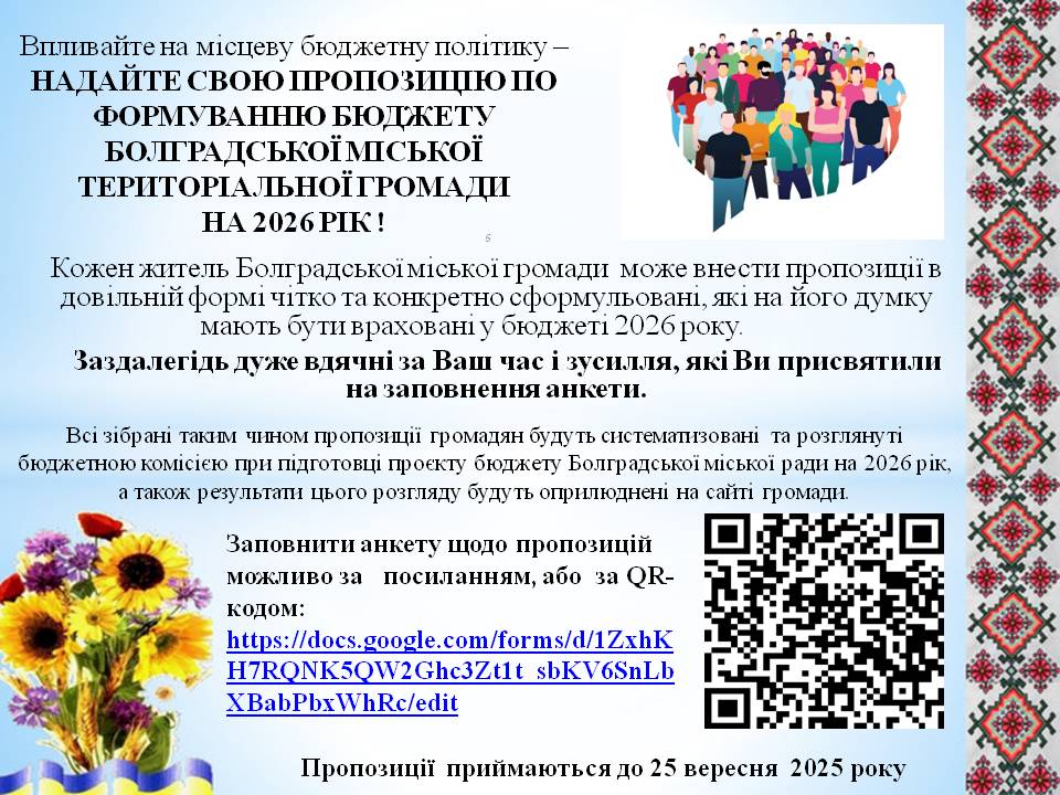 У міській раді обіцяють, що всі зібрані таким чином пропозиції громадян будуть систематизовані та розглянуті бюджетною комісією при підготовці проєкту бюджету Болградської міської ради на 2026 рік. Результати цього розгляду будуть оприлюднені на сайті громади.