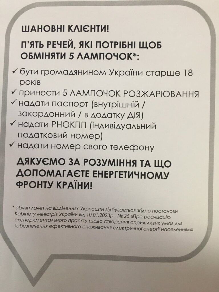 «Механізм обміну лампочок відбувається за двома сценаріями: при дії першого сценарію людина замовляє лампочки через портал «Дія», вказує там лампочки з яким цоколем йому потрібні. У другому випадку людина приходить одразу до відділення «Укрпошти» з паспортом та ідентифікаційним кодом, її дані вносять до реєстру, а потім видають лампочки, якщо вони є», – розповів Анатолій Петров.