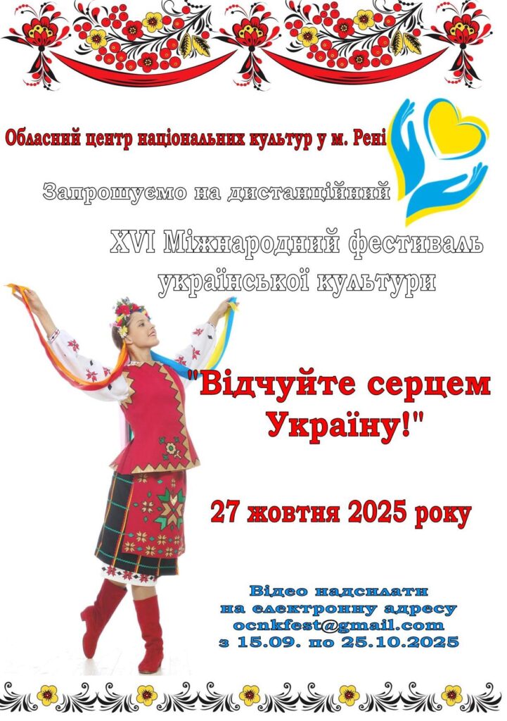 До Дня української писемності та мови у місті Рені стартував ХVI Міжнародний фестиваль української культури «Відчуйте серцем Україну!», який проходить у дистанційному форматі. Про це повідомляє інтернет-видання «Махала» з посиланням на обласний центр національних культур у місті Рені.