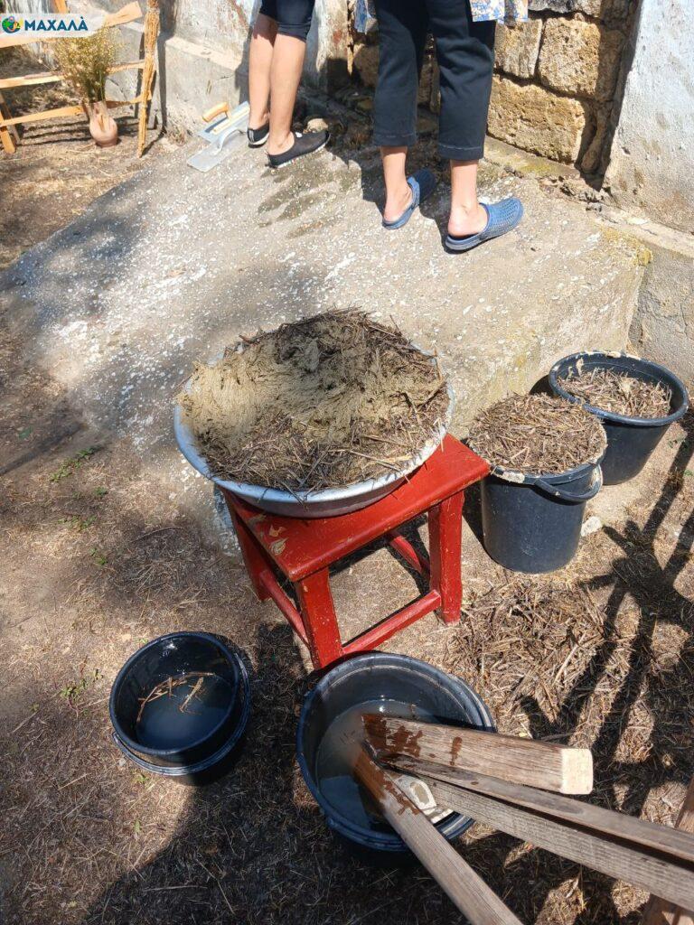 Після відвідин храму екскурсія продовжилася біля Будинку культури, де місцеві майстрині, відомі в народі як «мазачки», продемонстрували давнє ремесло утеплення та вирівнювання стін. Жінки розповіли, що для цього традиційно використовували суміш з глини, соломи та води. Після замішування матеріал залишали під плівкою на 3–4 дні, щоб він набув необхідної консистенції. Лише тоді його можна було застосовувати.