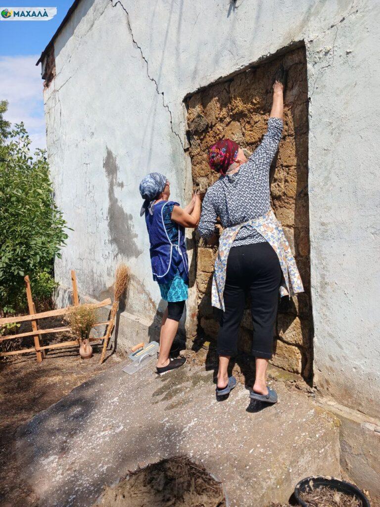 Після відвідин храму екскурсія продовжилася біля Будинку культури, де місцеві майстрині, відомі в народі як «мазачки», продемонстрували давнє ремесло утеплення та вирівнювання стін. Жінки розповіли, що для цього традиційно використовували суміш з глини, соломи та води. Після замішування матеріал залишали під плівкою на 3–4 дні, щоб він набув необхідної консистенції. Лише тоді його можна було застосовувати.
