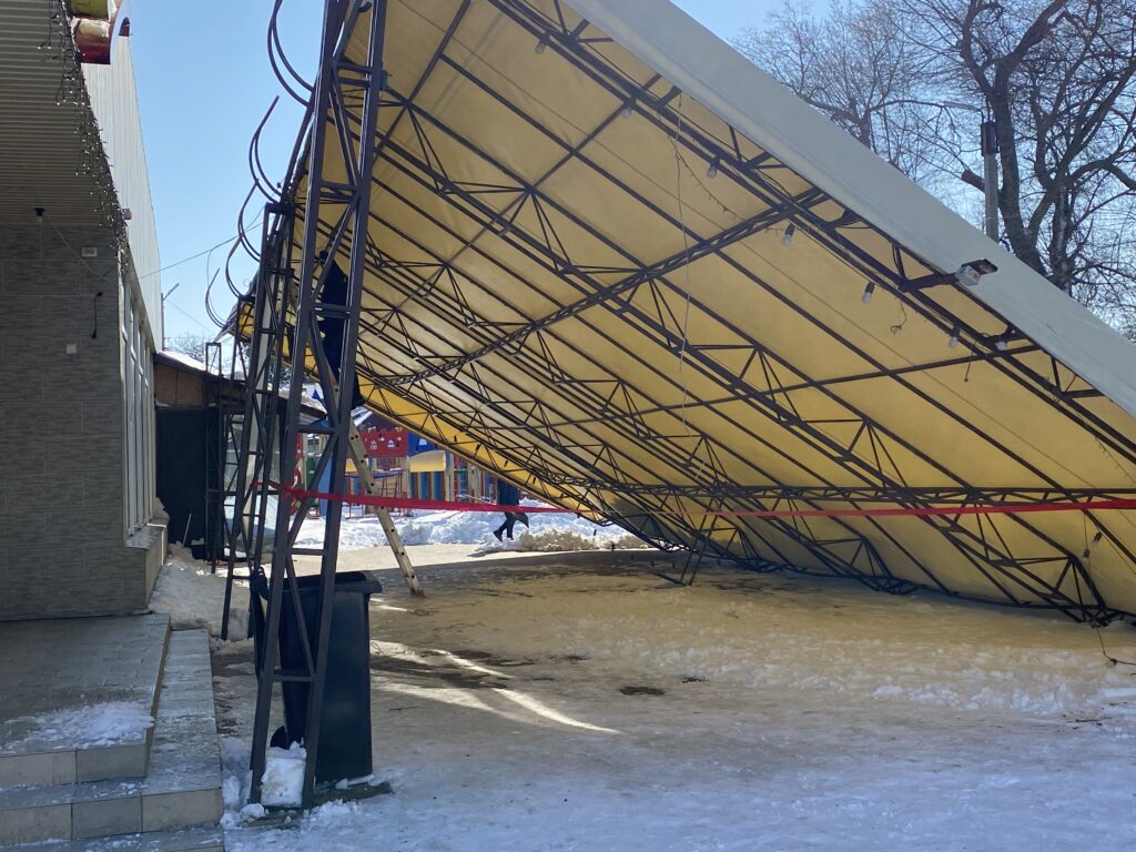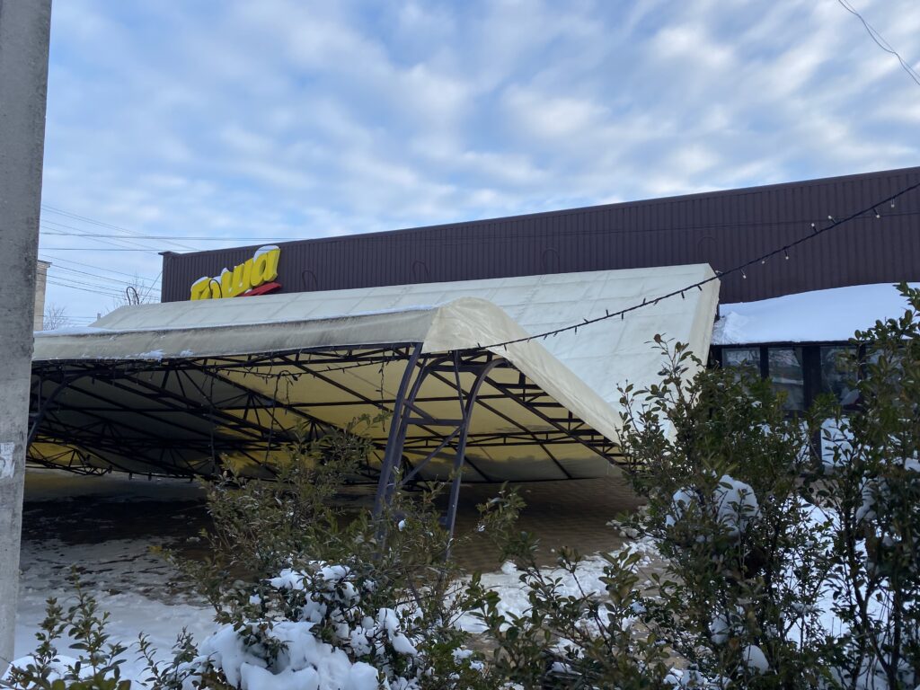 Сьогодні ця територія помічена червоною стрічкою, прохід закритий, а робітники супермаркету чистять сніг і знімають тент.Чи будуть ремонтувати навіс, чи знімуть повністю – адміністрація магазину коментувати відмовилася.