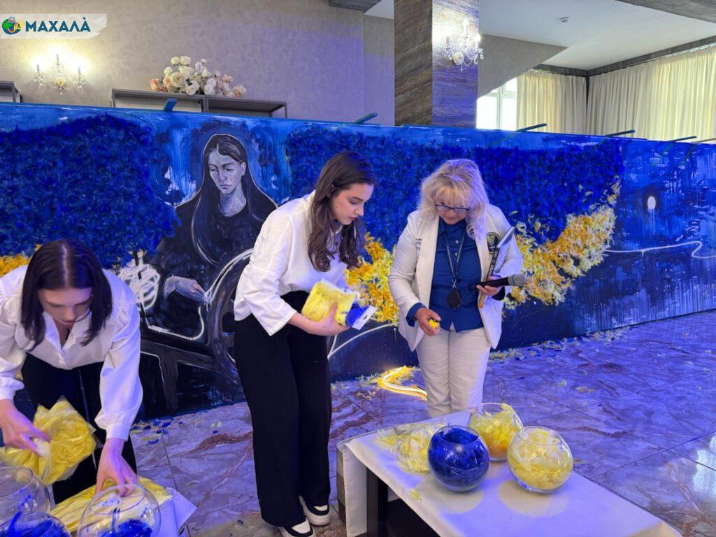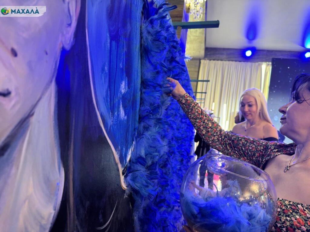 Учасниці заходу виходили до картини та наносили пір’я синього та жовтого кольору. Картину створила художниця Ольга Шарафаненко, яка спеціально приїхала для цього із Німеччини, щоб реалізувати ідею організаторів заходу.