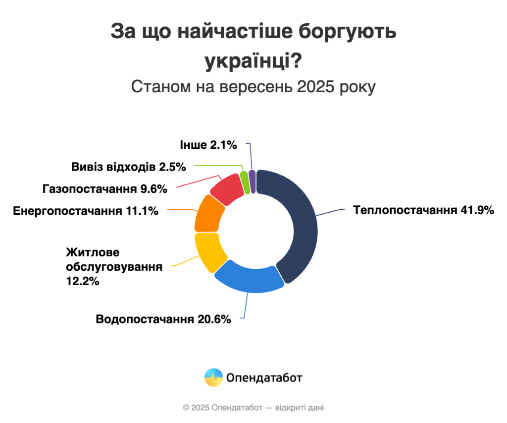 Левова частка заборгованостей стосується теплопостачання — 330 236 випадків (42%). Наслідують борги за воду — 162 455 (21%) та житлове обслуговування — 96 265 (12%). Також значні борги є за енергопостачання (87 708) та газ (75 522).