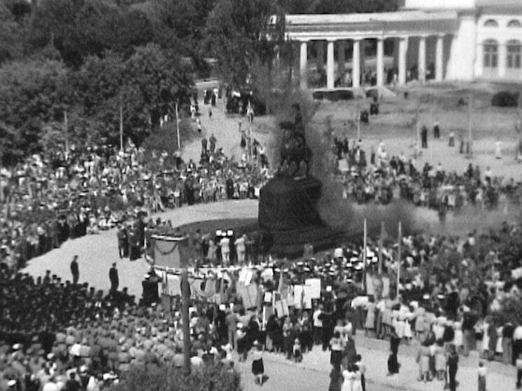 Відкриття пам’ятника О. Суворову. Кадр з фільму «На берегах радянського Дунаю» (1945 р.). Ілюстрацію взято зі статті Віктора Дроздова «Ізмаїл у радянській кінодокументалістиці 1940-х – початку 1950-х рр.»