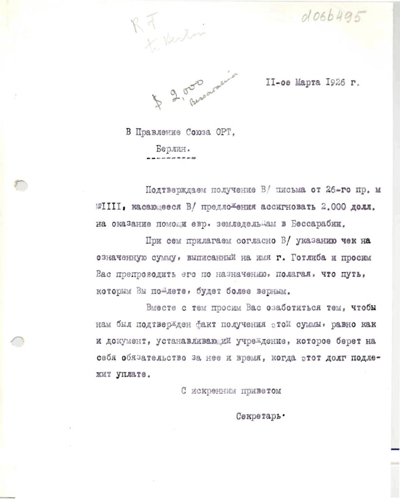 Один з листів, датований 11 березня 1926 року, свідчить про виділення 2000 доларів на підтримку фермерів Бессарабії, що дозволило допомогти десяткам господарств одночасно.