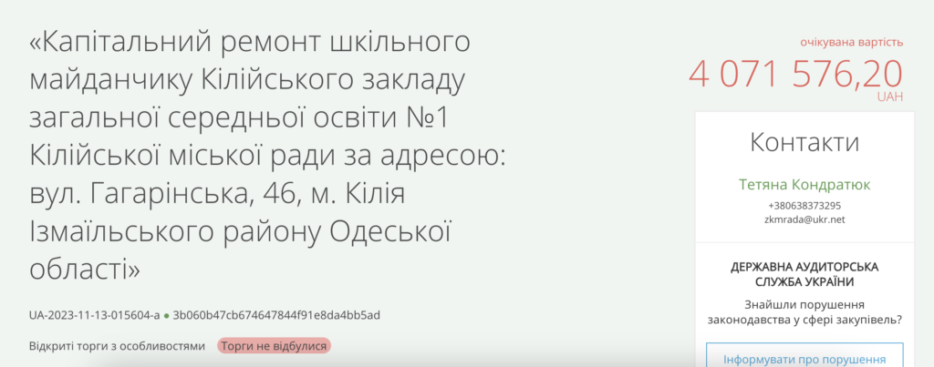Тиждень тому виконком Кілійської міської ради оголосив тендер на капітальний ремонт шкільного майданчика Кілійського закладу загальної середньої освіти №1 вартістю 4 071 576 гривень, що викликало резонанс серед громадськості.