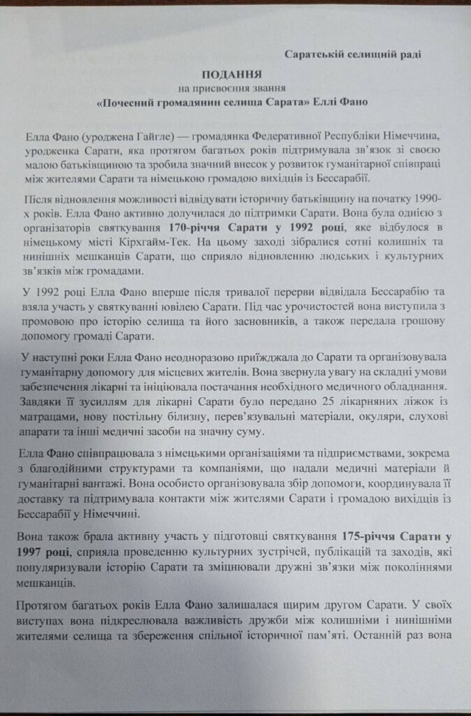 У селищі Сарата на Одещині створили ініціативну групу, яка пропонує присвоїти звання «Почесний громадянин селища Сарата» уродженці населеного пункту, громадянці Німеччини Еллі Фано. Про це повідомив начальник відділу культури та туризму Саратської селищної ради Анатолій Сухарський.
