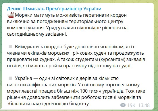 Кабінет міністрів України на засіданні 27 серпня дозволив морякам перетинати кордон, але лише за погодженням із військкоматом. Про це повідомив у Telegram прем’єр-міністр України Денис Шмигаль.