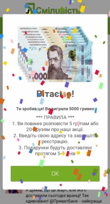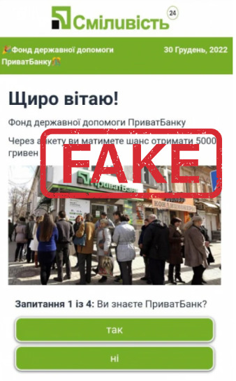 У соціальних мережах, зокрема, в українському сегменті фейсбуку, поширюють повідомлення про можливість отримати п’ять тисяч гривень допомоги від «ПриватБанку». Для цього нібито потрібно заповнити анкету та пройти невелике опитування. Однак це — шахрайство.