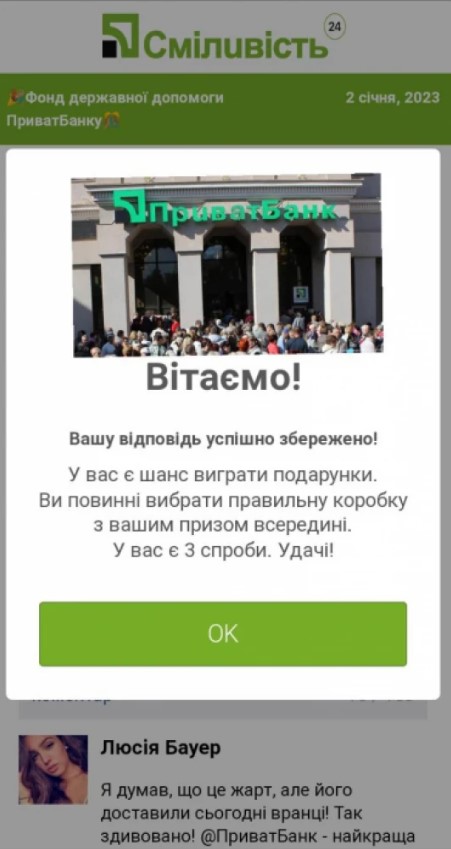Водночас на офіційному сайті «ПриватБанку» немає жодного слова про те, що організація здійснює виплати певної грошової допомоги від держави. Ба більше, люди, які начебто отримали виграш, пишуть з помилками у коментарях.