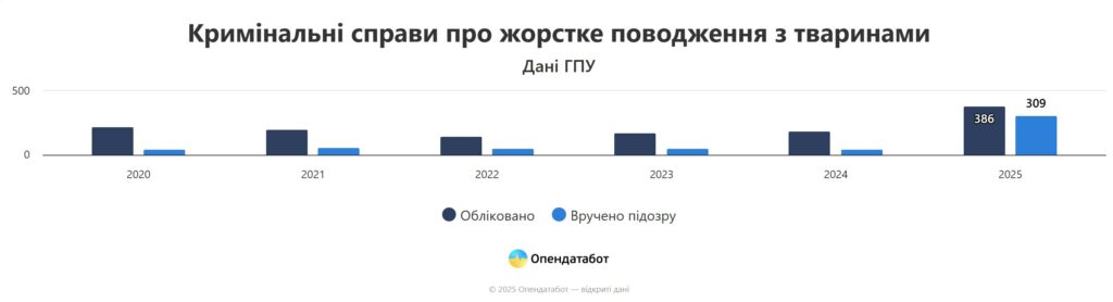 Рекордні 386 справ за жорстоке поводження з тваринами зафіксувала Генеральна прокуратура України (ГПУ) за п’ять місяців 2025 року. Про це повідомляє Опендатабот.