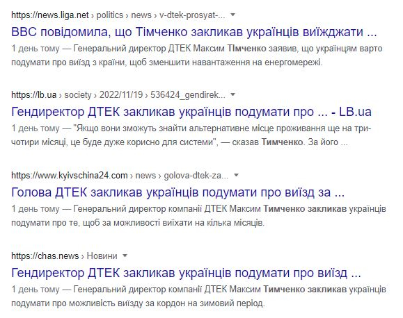 19 листопада на сайті Бі-бі-сі з’явилася новина із заголовком «Їдьте, якщо можете, щоб заощадити енергію — бос української енергетики». В новині цитували генерального директора компанії ДТЕК Максима Тімченка, який дав Бі-бі-сі інтерв’ю. Більшість слів із цієї розмови була наведена в переказі, відеоінтерв’ю з Тимченком не публікували. В матеріалі використали чотири фрази представника ДТЕК прямою мовою, дві з них безпосередньо стосувалися необхідності виїхати або зменшити споживання електроенергії для збереження стабільності роботи системи.