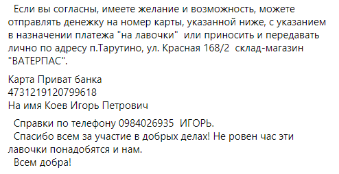 Также через соцсети активист обратился к старостам сел, входящих в Тарутинскую громаду, подхватить эту идею. Ведь не только Тарутино имеет такую пересеченную местность. И там тоже живут люди, которым нужны лавочки на крутых подъемах.