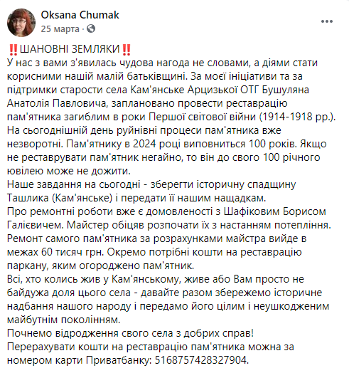 После этого через Фейсбук активистка обратилась к односельчанам и уроженцам села о сборе средств на ремонт памятника. Она отметила, что в 2024 году ему исполнится 100 лет. Но если не остановить разрушения, то до своего юбилея он не доживет. Только на реставрацию необходимо собрать порядка 50 тысяч гривен, не говоря о ремонте ограждения и благоустройстве прилегающей территории. Разрушающийся памятник находится в центре села, возле церковной ограды.