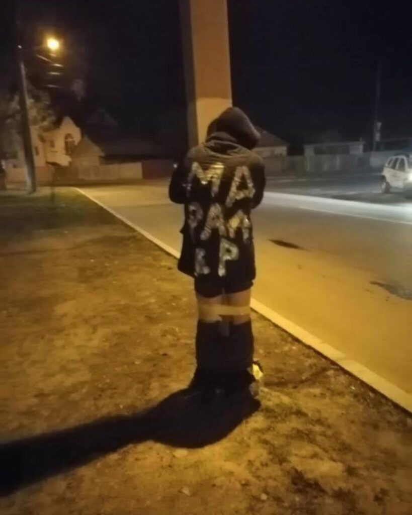 По ставшей в Украине популярной схеме, мужчину примотали к скотчем к столбу, а на спину нанесли характерную надпись.
